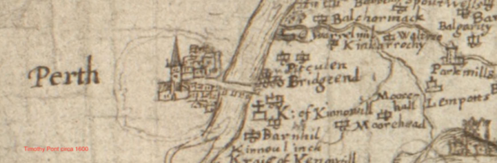 We do know that from the 13th-century there was ancient bridged crossing in Perth itself. It is mentioned in an Inchaffray Charter of 1202 and a Scone Charter of 1219. The city had become the effective capital of Scotland, the royal residence for long periods and the seat of many Scottish parliaments. In the 12th century it was the richest trading city in the country. The river was navigable, and the harbour was adjacent to the High St. The city bridge was also here. The bridged crossing existed for 400 years until the last one was swept away by floods in 1621. Then, for 150 years, there was no bridge and it was not finally replaced until the later eighteenth century. A bridge appears on Pont’s maps of 1600 but not on Adair (1680s), nor on Roy in 1750. Pont’s bridge is 200m downstream of the present bridge effectively extending across the river from the High St.