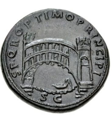 Several coins had been struck celebrating the emperor’s arrival in Britain in 207, but one in particular, firmly dated to 208, features a permanent bridge over a river with two towers and a single arch. It is a bronze As.