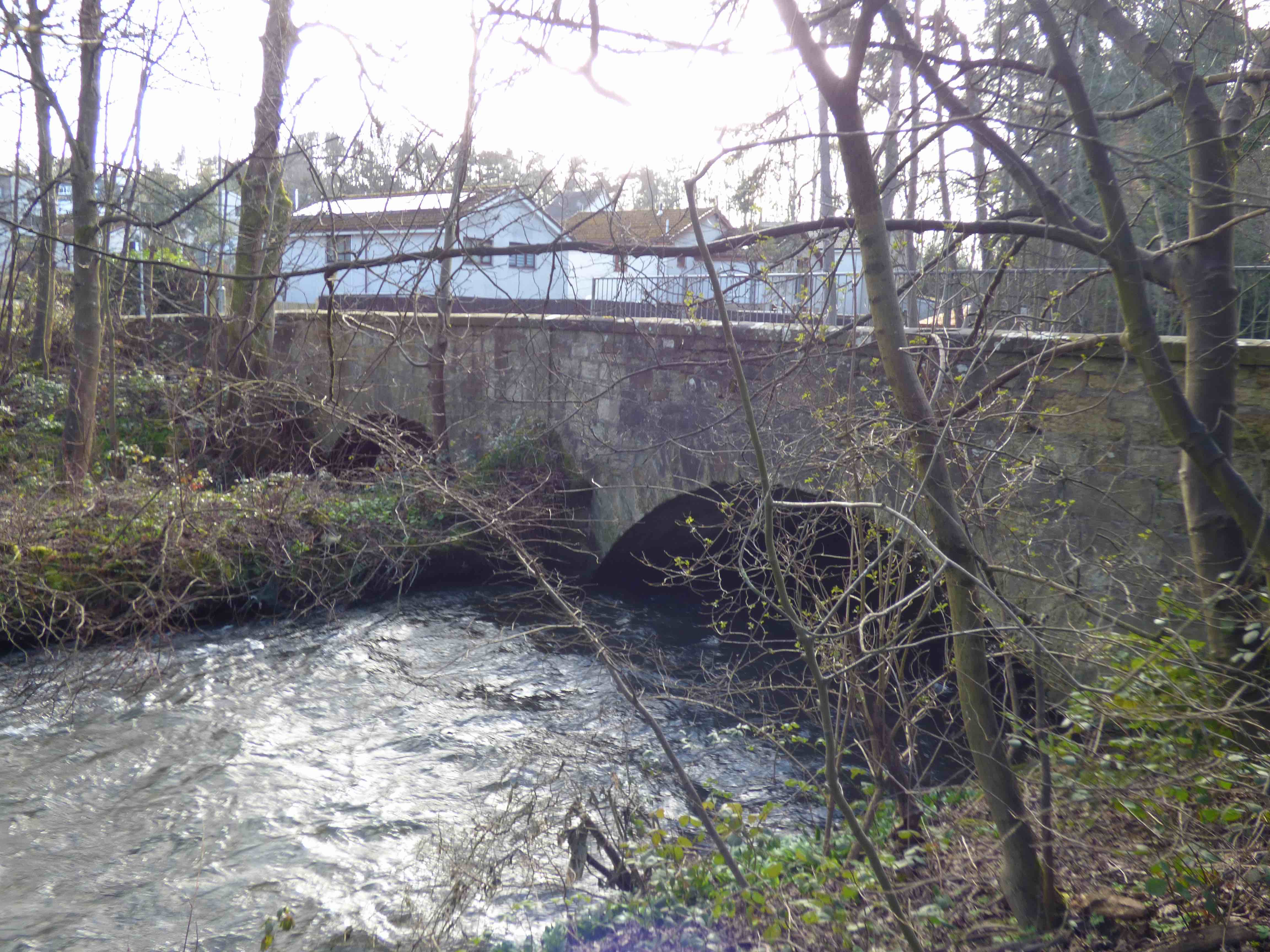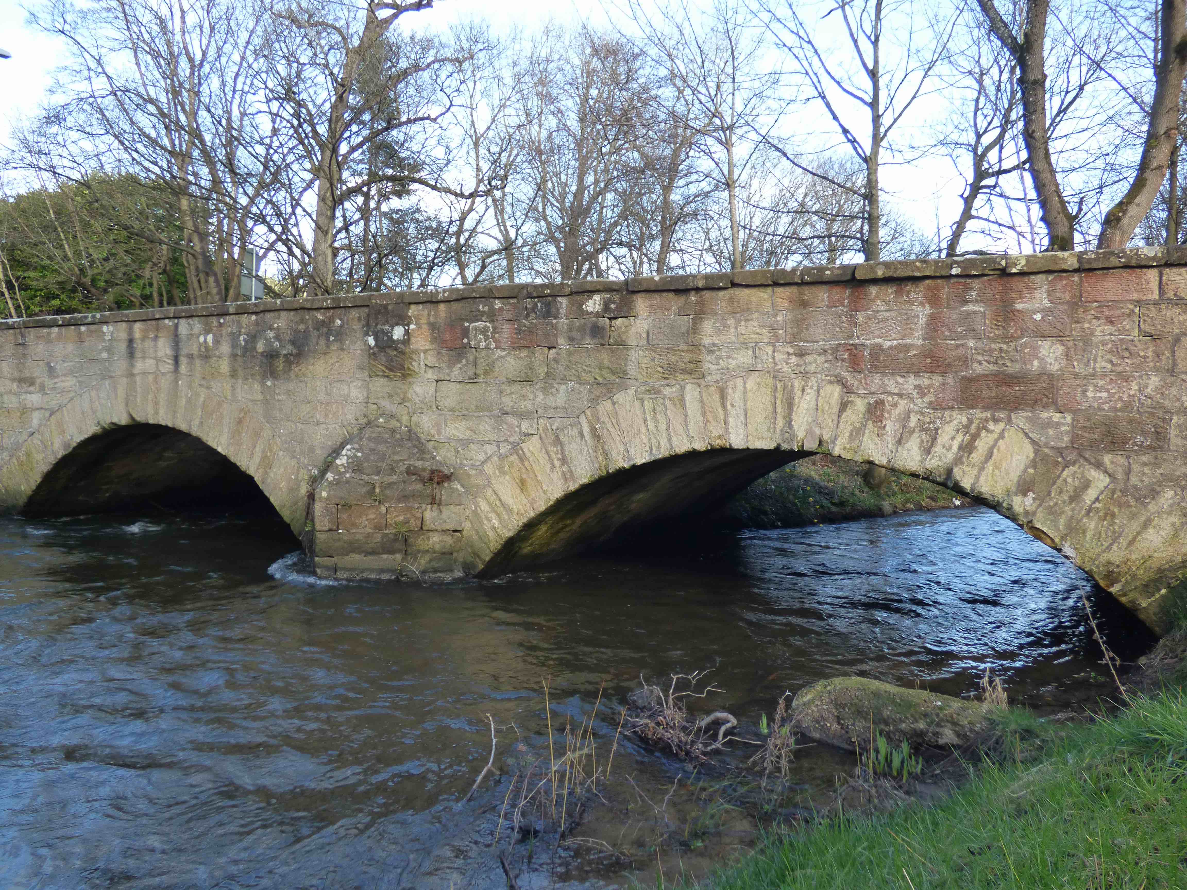 Currently: Early 17th century reconstruction of a pre-reformation bridge. Mainly 17th century. Four segmental arches, raised and ribbed. The bridge is humped and narrow (11-12 ft.) It now has four ribs on the un-widened side. Blocked-in coursed squared finely dressed pink sandstone spandrels and cutwaters.
