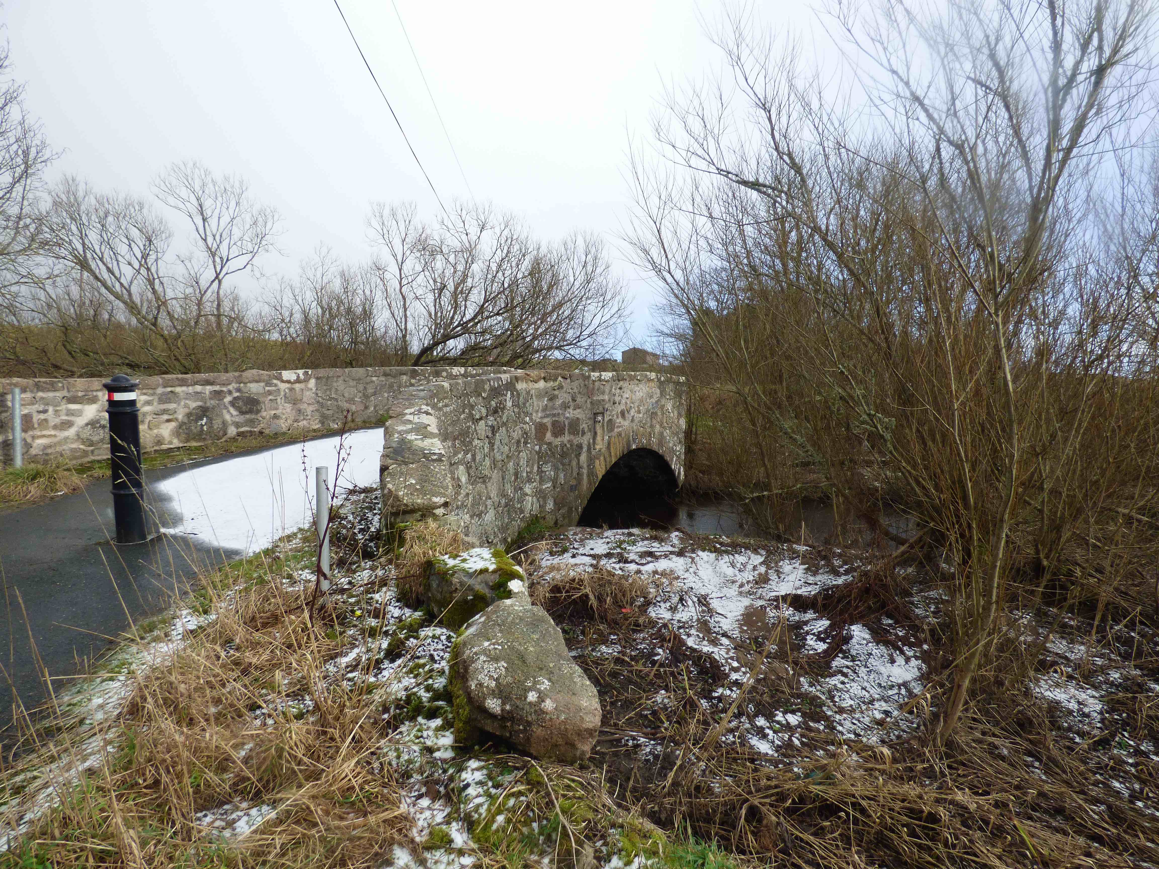 Currently: 18th century humped two segmental arched bridge. Random rubble, hardly dressed. Whinstone voussoirs which are radially aligned and of irregular length. Pitch-dressed rubble coping. Slightly splayed. Cutwaters on both sides. Filled oculus. The bridge is in remarkably good shape. 11ft wide between parapets. 16ft spans. It has been suggested that this may be later 18th century because of the oculus (characteristic of Smeaton and Mylne). However, its other features, along with its presence on Roy, strongly suggest early 18th century.